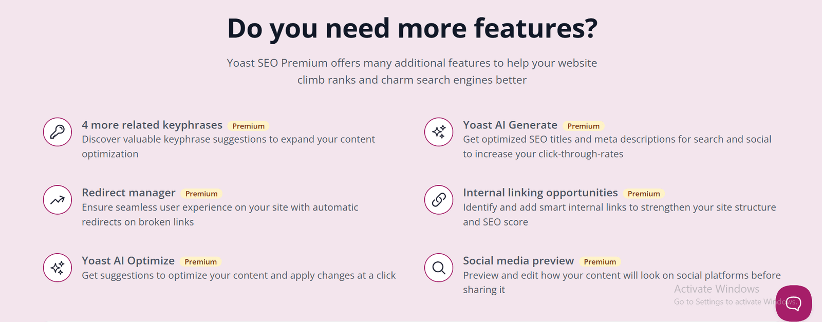 The free version covers basics, but advanced features require a subscription, which may not be affordable for small blogs or startups. Premium features include multiple focus keywords, redirect management, and internal linking suggestions.