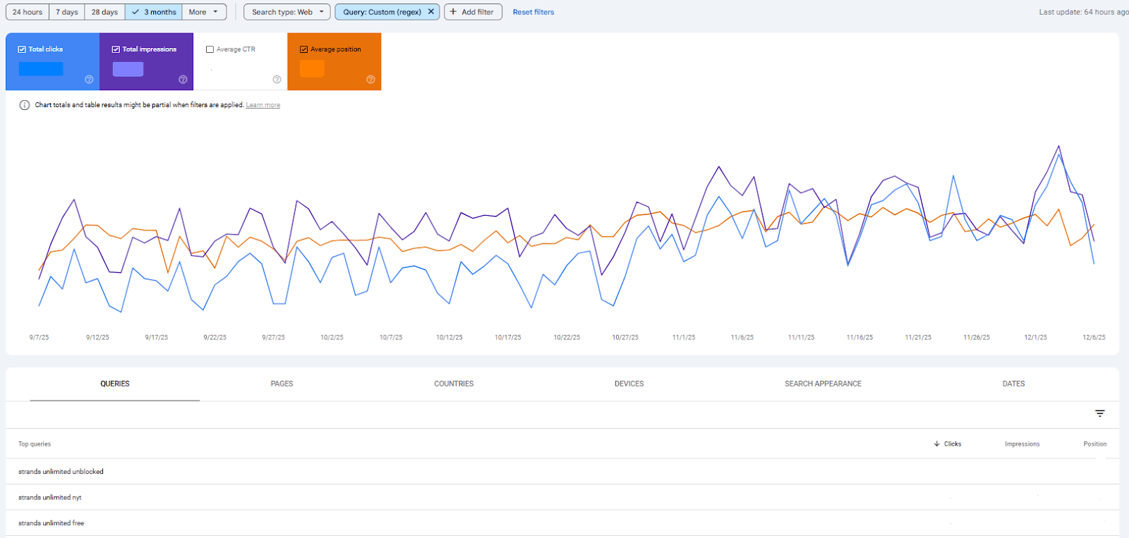 This regex shows all queries containing the brand NYT keyword. This regex gave us insight into where we ranked relative to our main competitor.